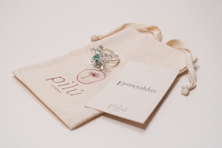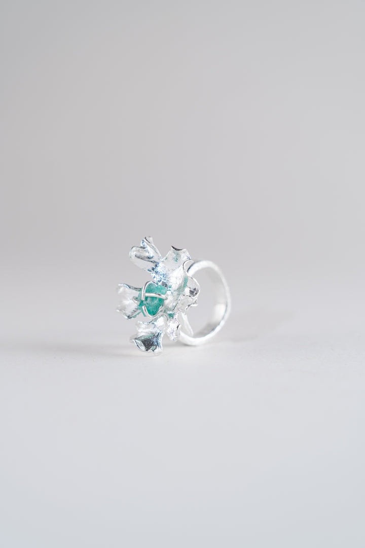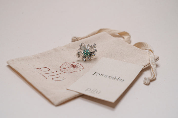 De la colección Reverdecer, anillo en forma de liquen plata ley 950 y esmeralda en bruto. cada piedra es única por lo cual te enviaremos las opciones disponibles al momento de tu compra para tu elección.