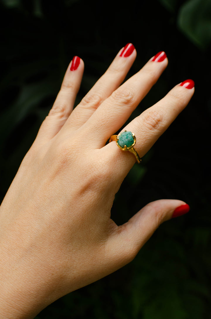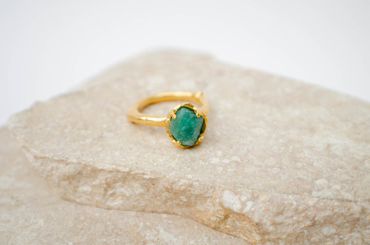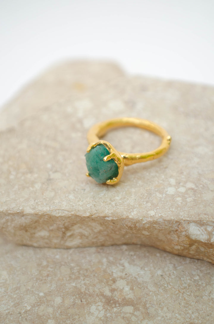 Anillo en plata ley 950, baññado en oro de 24 kl. Con piedra esmeralda en bruto, de la mina de Muzo en Boyacá.