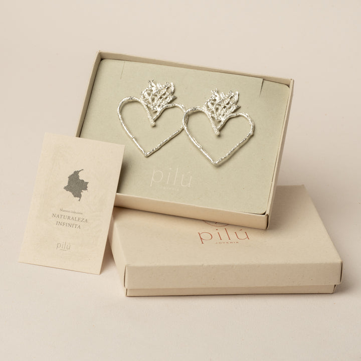 Aretes Corazón Rama Pino Plateado