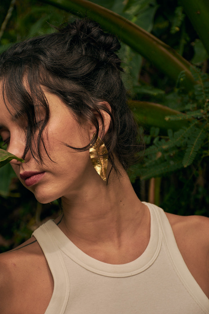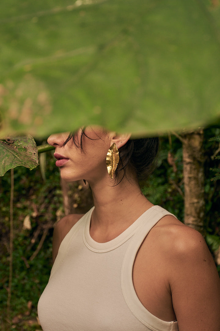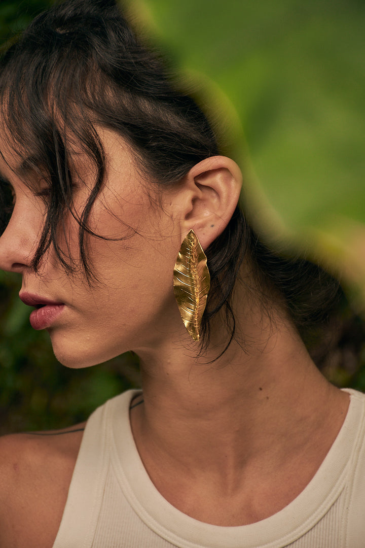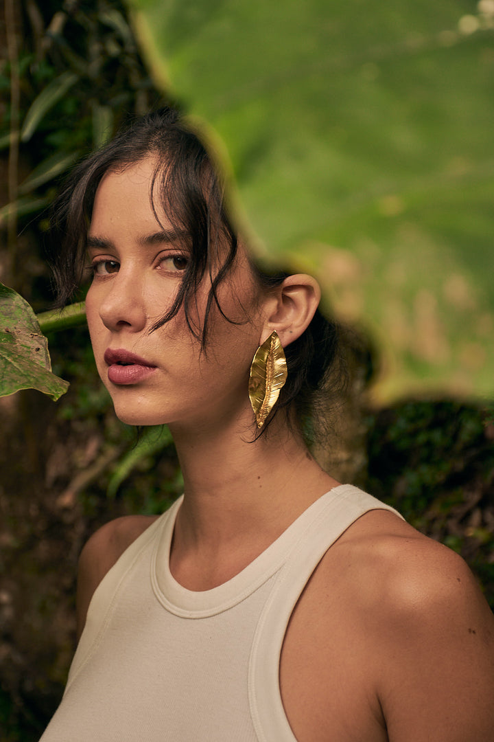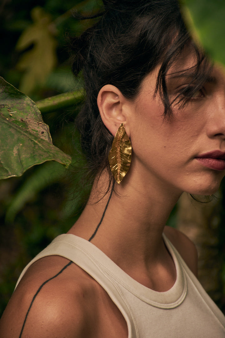 Aretes grandes en forma de hoja de huito en bronce en baño de oro de 24kl.