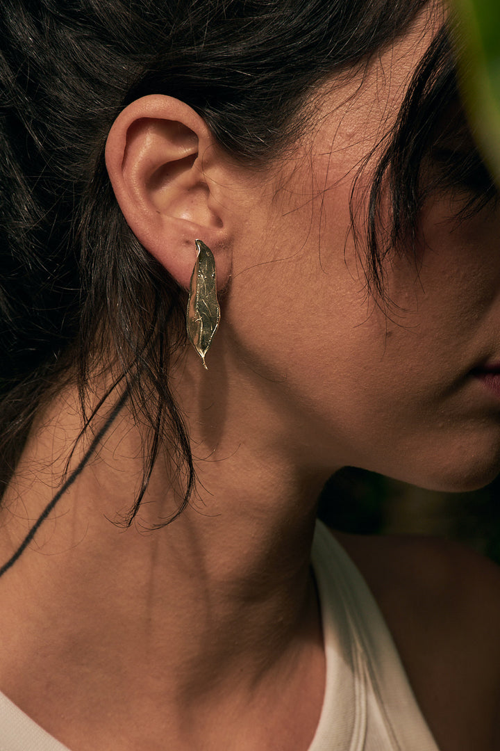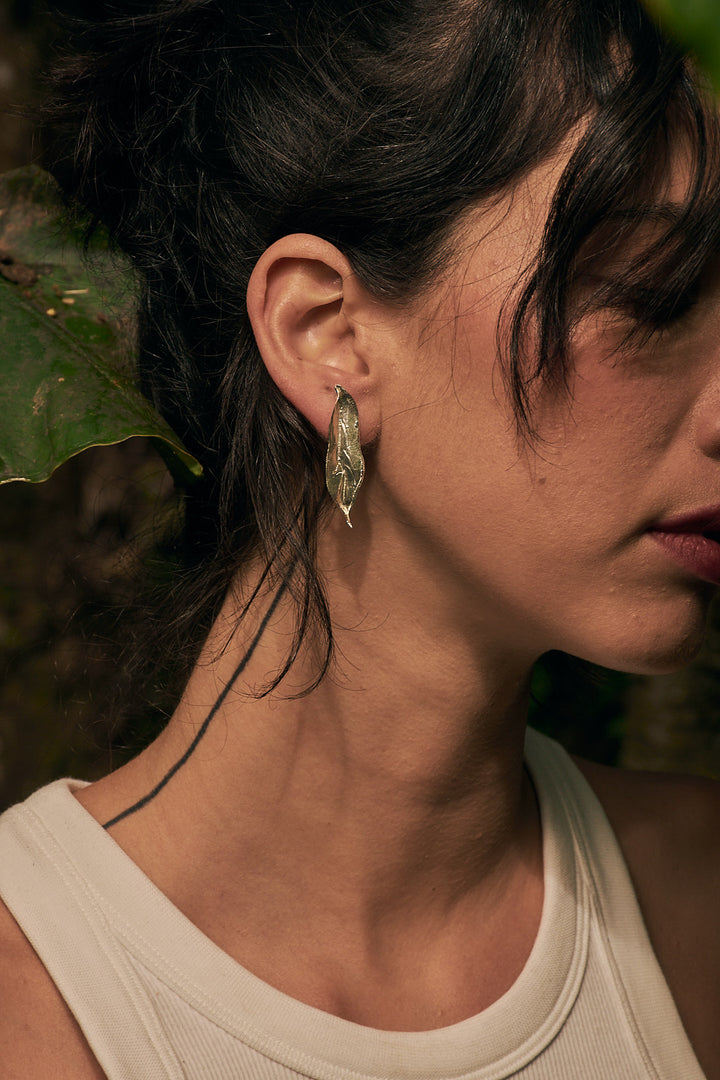 Aretes en forma de hoja de cúrcuma en plata ley 950.