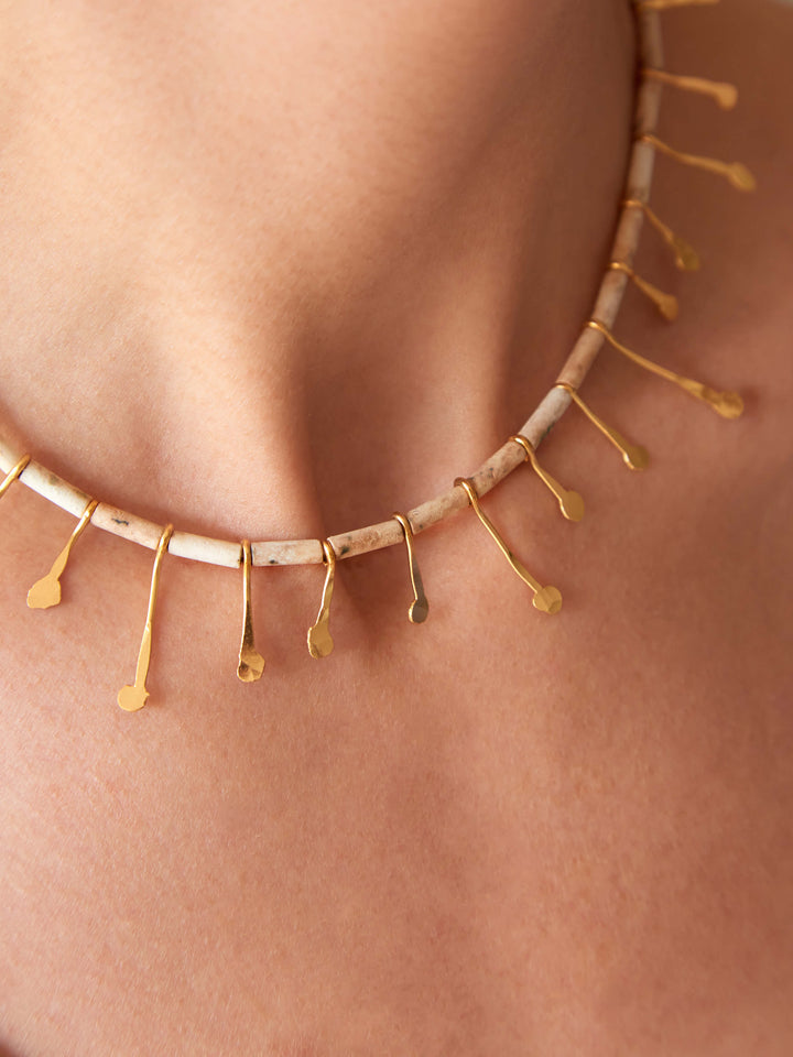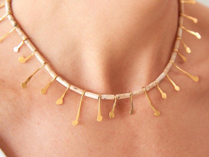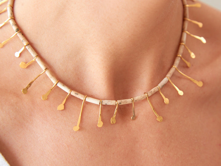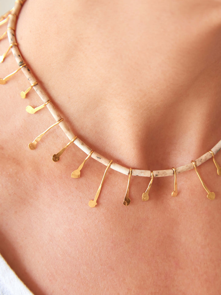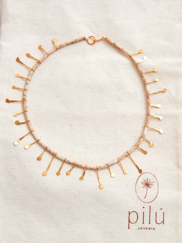 Collar con cuentas de cerámica tubulares color beige y dijes hechos a mano en forja, en broce con baño de oro de 24K, libre de Níquel.