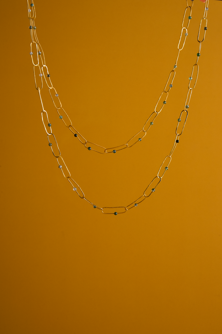 Collar de eslabones con acabado en forja y piedras naturales agata musgo, en bronce con baño de oro de 24 Kl. Líbre de niquel.
