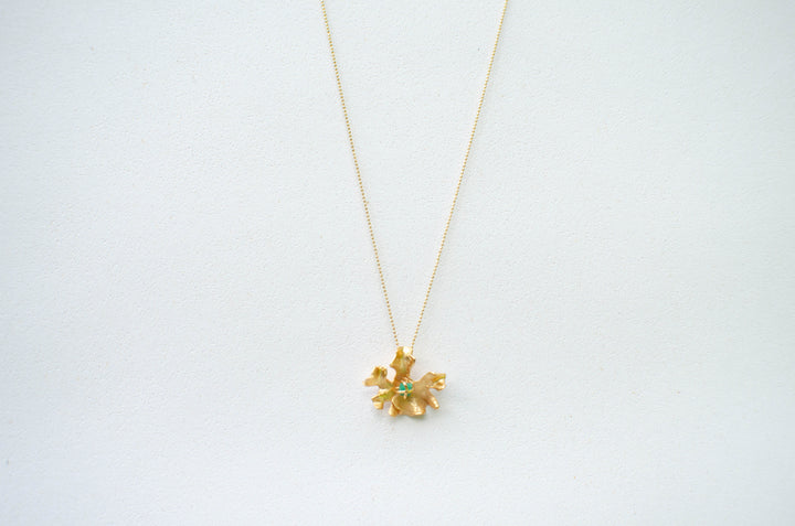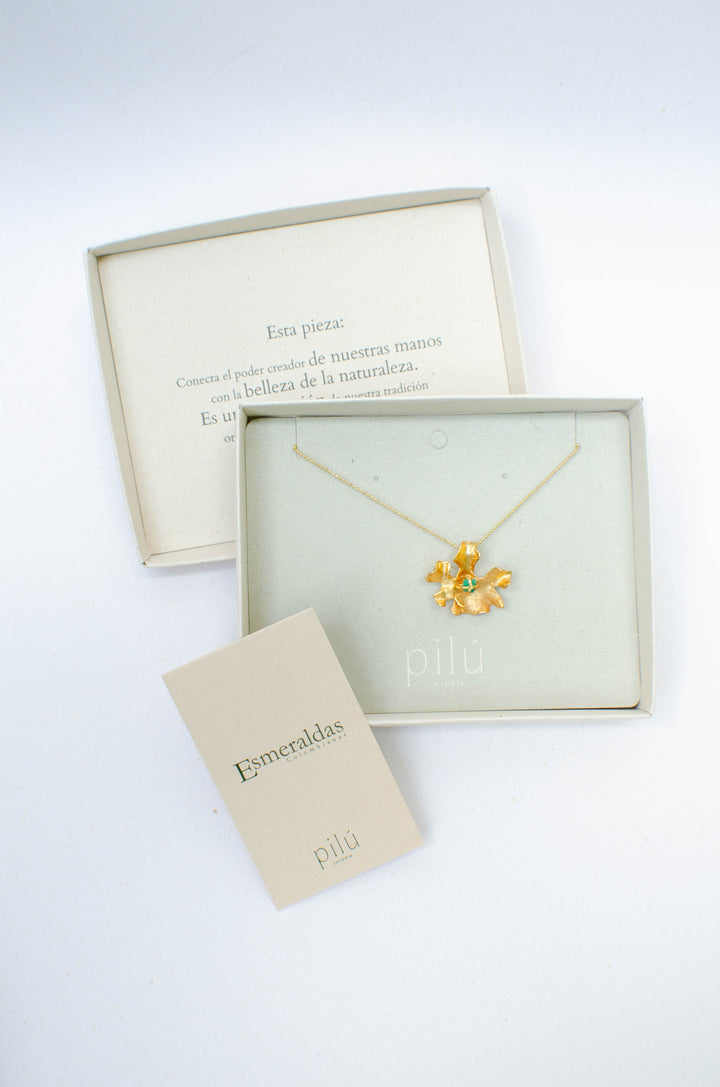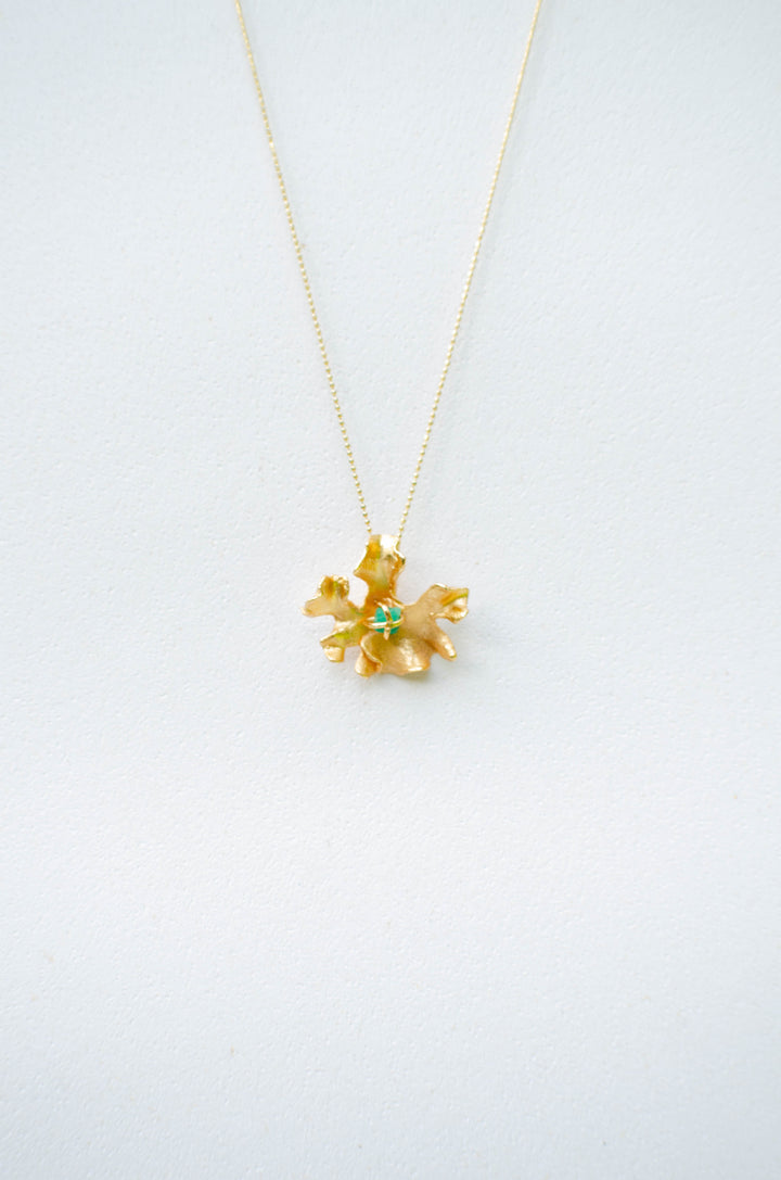 Collar liquen con esmeralda en bruto, hecho en bronce con baño en oro de 24 kl, laca protectora y libres de níquel. Hipoalergénico. con laca protectora para mayor duración.