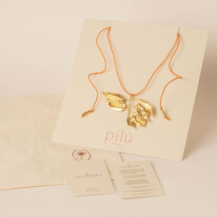 Collar rama achiote dorado en bronce con baño de oro de 24 kl libre de níquel. Cadena de cumare.