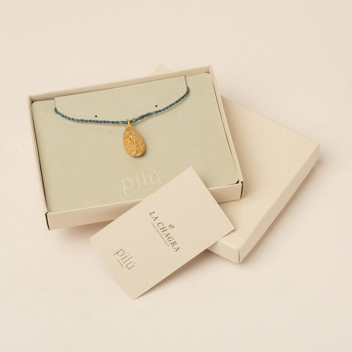 Collar con dije de semilla de huitillo alargado en bronce con baño de oro de 24 kl libre de níquel. Cadena de cumare.