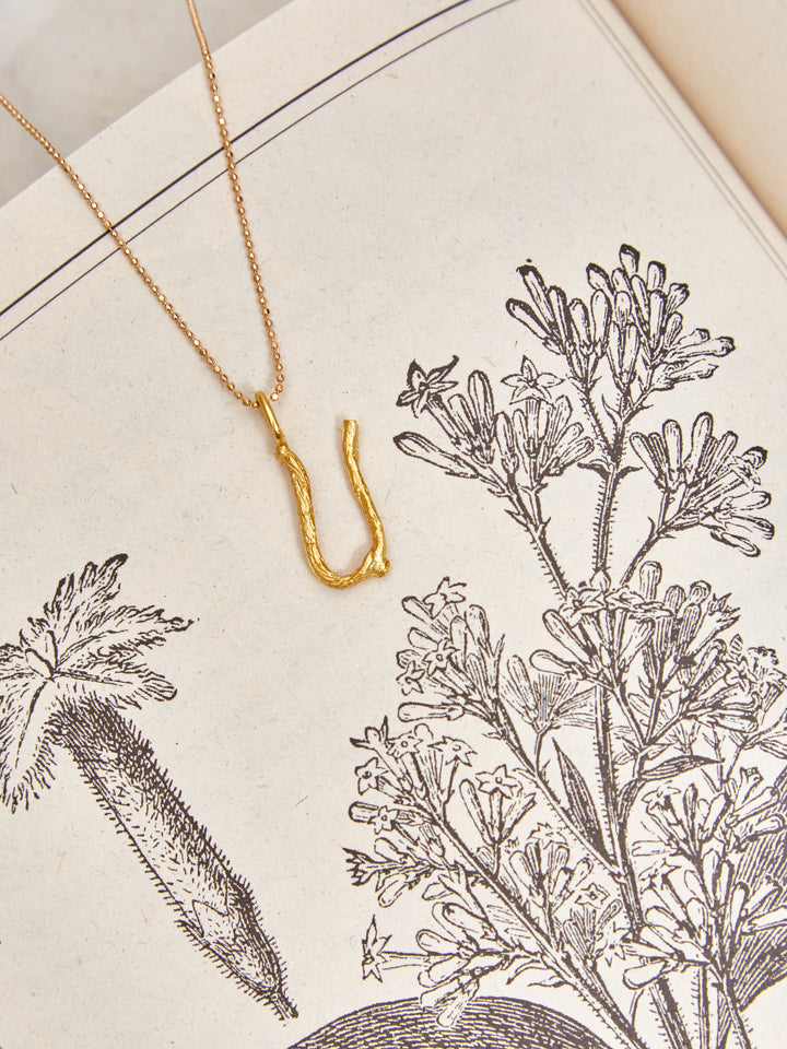Collar con dije de letra U en bronce con baño de oro de 24 kl con textura palo pino